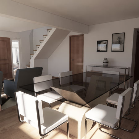 Se genero un espacio continuo de living y comedor, separados de una nueva cocina, con una escalera hacia el dormitorio del segundo piso.